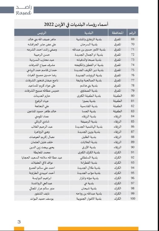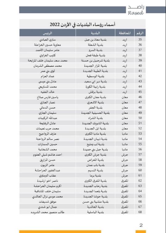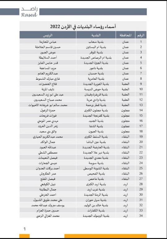 السوسنة : أعلن مركز الحياة راصد، اليوم الأربعاء، أسماء كافة الفائزين بمقعد رؤساء البلديات في كافة محافظات الأردن.
