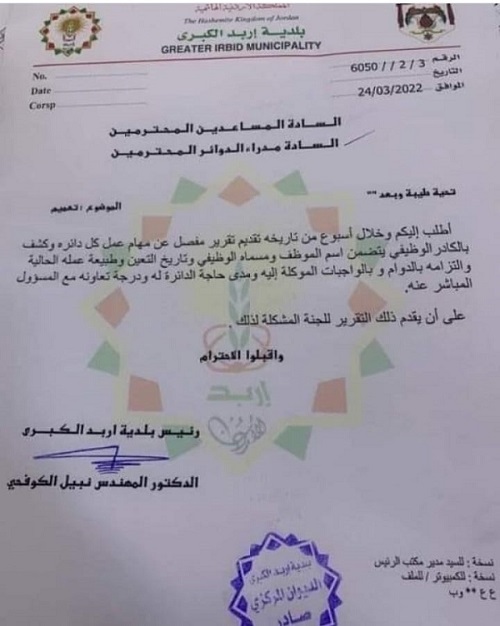 السوسنة - وجه رئيس بلدية إربد الكبرى المنتخب نبيل الكوفحي أول كتاب له إلى المساعدين ومدراء الدوائر بالبلدية بتزويده بتقرير مفصل خلال أسبوع عن مهام كل دائرة وكشف بالكادر الوظيفي ومهامه وتاريخ تعيين كل منهم وطبيعة عمله.