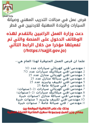 السوسنة - دعت وزارة العمل ، الأردنيين البحاثين عن فرص عمل في دولة قطر من أصحاب التخصصات في الإعلان المرفق الى التقدم عبر منصة العمل القطرية الأردنية التي اعيد تفعيلها.