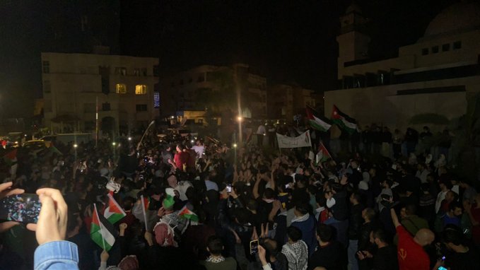 السوسنة - شارك المئات في وقفة احتجاجية، مساء الجمعة، قرب مسجد الكالوتي في منطقة الرابية، وهي منطقة قريبة من السفارة الإسرائيلية؛ احتجاجا على اعتداءات سلطات الاحتلال الإسرائيلي على مصلي المسجد الأقصى واقتحامهم الحرم القدسي.