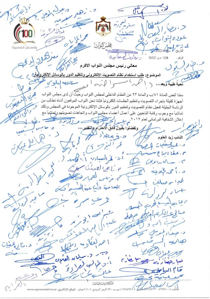 السوسنة - وقع 93 نائبا مذكرة نيابية للمطالبة بالتصويت الالكتروني وادارة الجلسات بإستخدام المعدات الالكترونية.