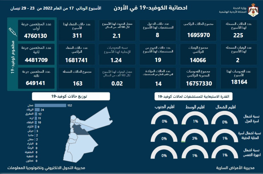 السوسنة - أعلنت وزارة الصحة، اليوم الأحد، تسجيل وفاتين و225 إصابة بكورونا خلال أسبوع.