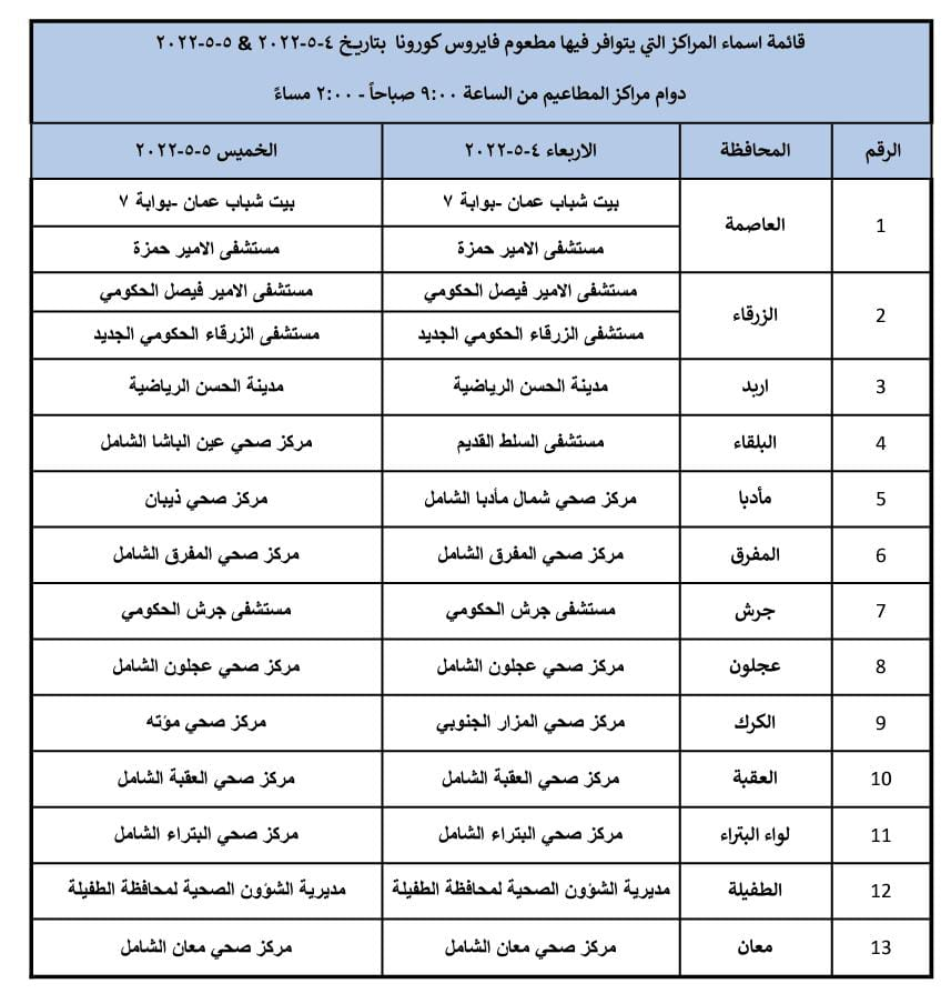السوسنة - أعلنت وزارة الصحة، أسماء المراكز التي يتوفر فيها مطعوم فيروس كورونا (بدون موعد مسبق) جميع الجرعات ليومي الاربعاء والخميس 2022/5/4 – 2022/5/5.
