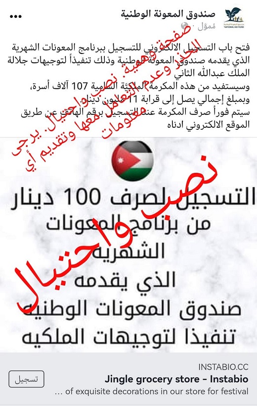 السوسنة - حذر صندوق المعونة الوطنية، من وجود صفحات مزورة في مواقع التواصل الاجتماعي وتطبيق “الواتس آب” تتحايل على المواطنين، وفق مدير عام صندوق المعونة الوطنية بالوكالة أمين عام وزارة التنمية الاجتماعية، الدكتور برق الضمور.