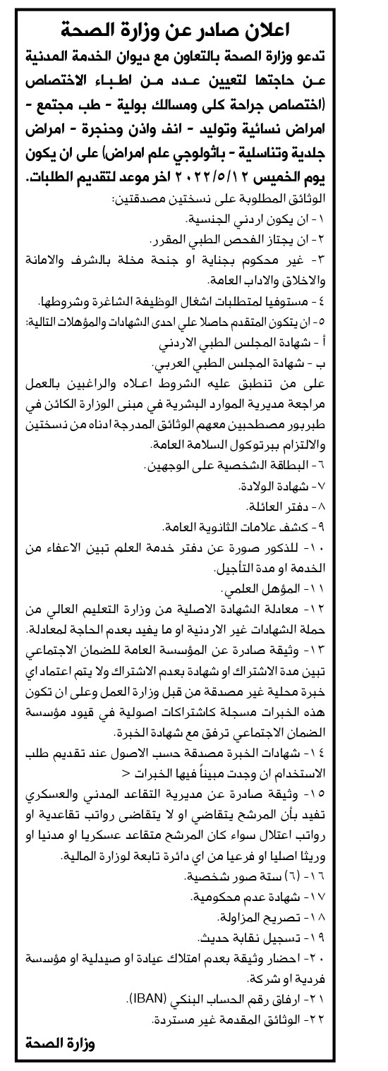 السوسنة - أعلنت وزارة الصحة عبر موقعها الالكتروني، بالتعاون مع ديوان الخدمة المدنية الثلاثاء، عن حاجتها إلى تعيين عدد من أطباء الاختصاص.