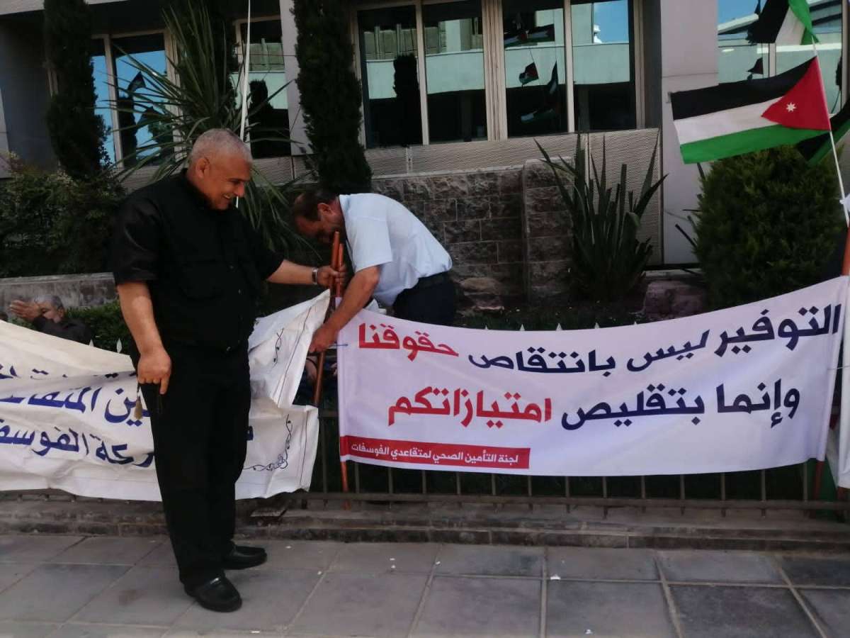 السوسنة - استأنف متقاعدو شركة الفوسفات الأردنية، الاثنين، اعتصامهم أمام مقر ادارة الشركة في عمان وذلك بعد فشل التوصل لاتفاق مع الادارة العليا حول التأمين الصحي.