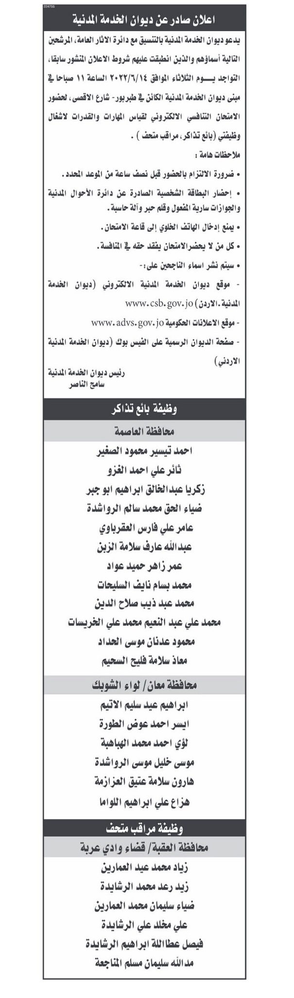 السوسنة - دعا ديوان الخدمة المدنية بالتنسيق مع دائرة الآثار العامة، مرشحين لحضور الامتحان التنافسي الإلكتروني، الثلاثاء المقبل الموافق 14/6/2022 في تمام الساعة 11 صباحا، في مبنى ديوان الخدمة المدنية.