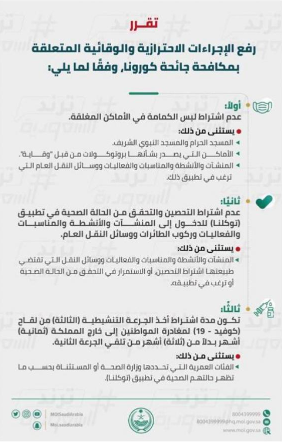 السوسنة - قررت المملكة العربية السعودية الاثنين، رفع الإجراءات الاحترازية والوقائية المتعلقة بمكافحة جائحة كورونا.