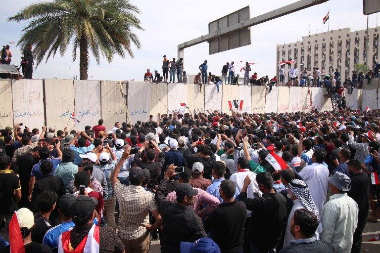 وقال شهود عيان لوكالة الأنباء الألمانية (د.ب.أ) إن المتظاهرين تمكنوا من إسقاط الكتل الأسمنتية رغم استخدام قوات الأمن خراطيم المياه والقنابل المسيلة للدموع، ونجحوا في الدخول إلى المنطقة الخضراء واقتحام البرلمان.