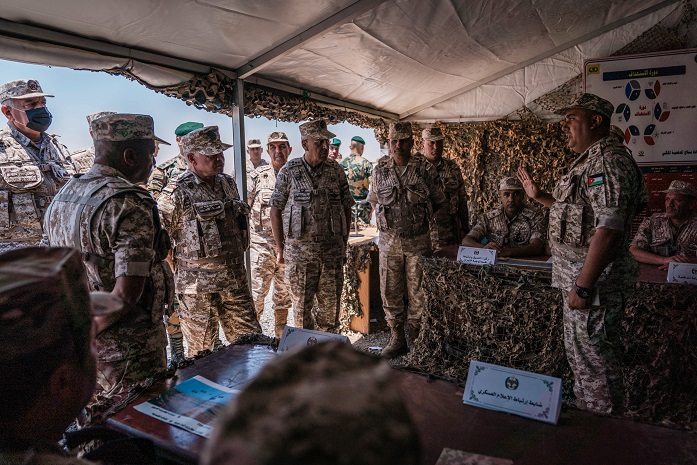 واستمع جلالة الملك إلى إيجازين، قدمهما المساعد للعمليات والتدريب العميد الركن عبدالله شديفات وقائد المنطقة العسكرية الوسطى العميد الركن عبدالله الحنيطي، حول سير الأمور العملياتية والتدريبية والفنية واللوجستية والفرضيات التي بني عليها التمرين.