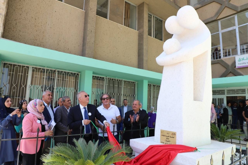 السوسنة ـ أزاح رئيس جامعة اليرموك الدكتور إسلام مساد، الأحد، الستار عن منحوتة "الأجيال الثلاثة" الفنية والتي جرى تشييدها أمام مبنى كلية السياحة والفنادق في الجامعة، بإهداء من المكتب التنفيذي لإربد عاصمة الثقافة.