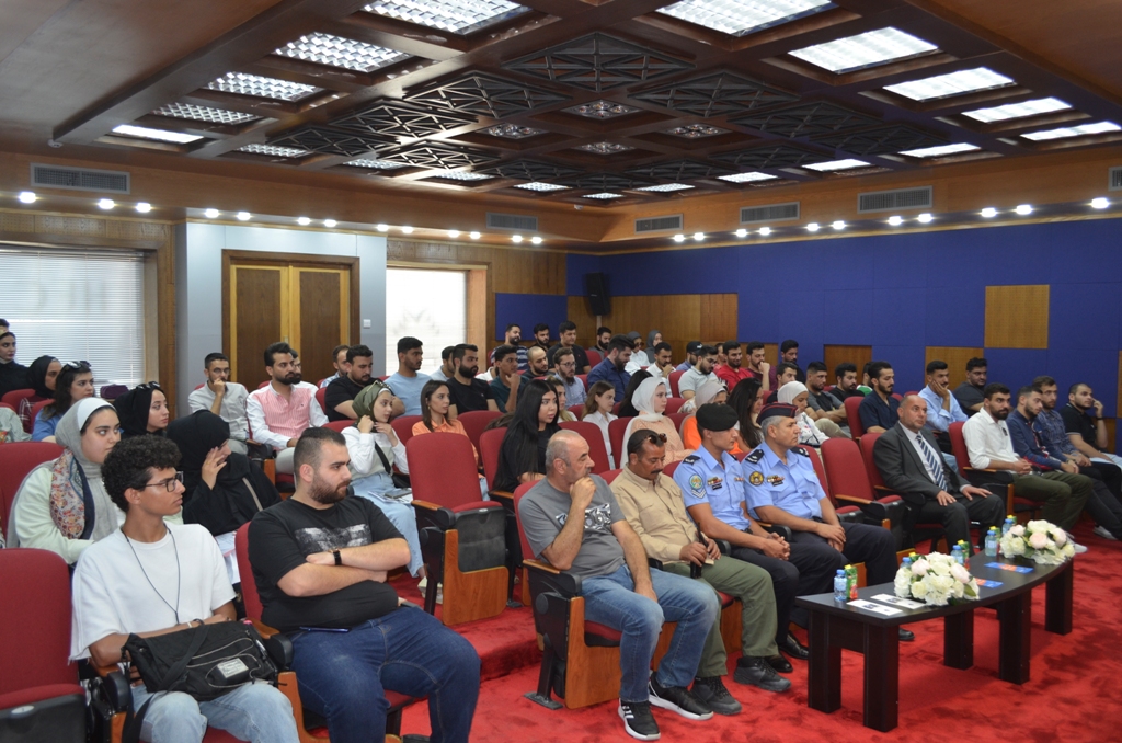 وفي بداية الندوة رحب مساعد عميد شؤون الطلبة الدكتور خالد الشياب بمرتبات وضباط مديرية الأمن العام وكافة الحضور، مؤكداً على حرص كافة الأجهزة الأمنية بتوفير حياة مفعمة بالأمن والأمان من خلال التوعية المستمرة التي تقوم بها إدارة الشرطة المجتمعية والمعهد المروري الأردني في مجال السلامة العامة والسلامة المرورية.