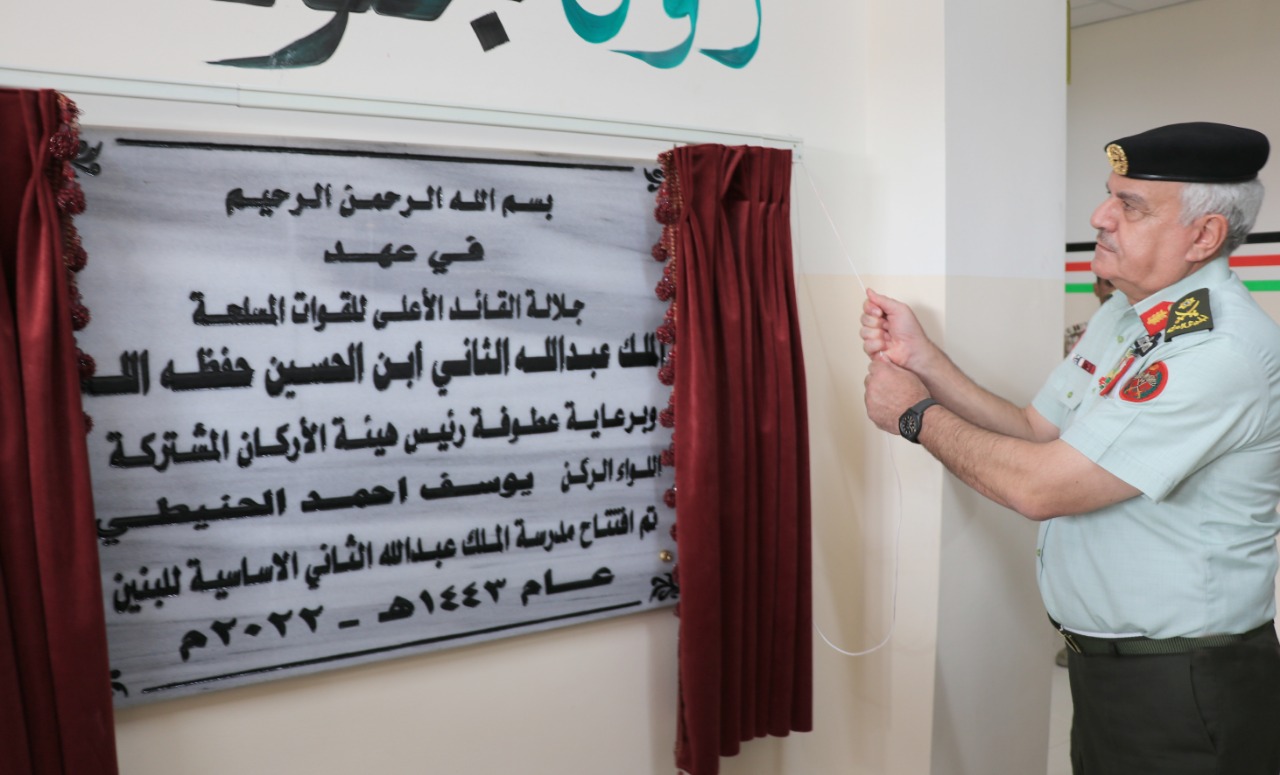 جاء ذلك خلال افتتاح رئيس هيئة الأركان المشتركة، الخميس، مدرسة الملك عبدالله الثاني الأساسية للبنين التابعة لمديرية التربية والتعليم والثقافة العسكرية في منطقة سما السرحان بمحافظة المفرق، وكان في استقباله مدير التربية والتعليم والثقافة العسكرية العميد الركن علي قبلان الدعجة ومدير المدرسة الرائد عبدالله السرحان.