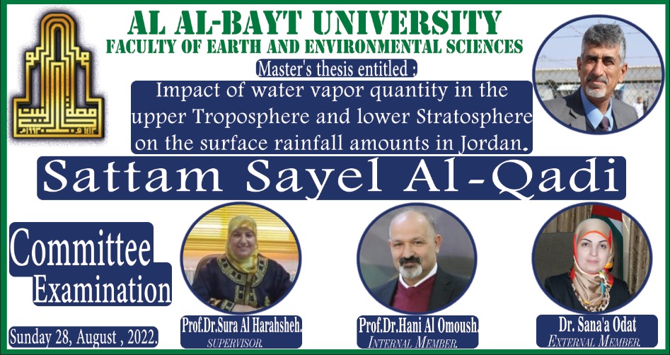 أثر كمية بخار الماء في طبقة التروبوسفير العليا والستراتوسفير السفلى على كميات الأمطار السطحية في الأردن وتشكلت لجنة المناقشة من أ.د. سرى الحراحشة مشرفاً رئيسياً ورئيساً وعضوية كل من؛ د. سناء العودات مناقشاً خارجياً من جامعة اليرموك ؛ و أ.د. هاني العموش مناقشاً داخلياً من قسم علوم الأرض والبيئة التطبيقية.