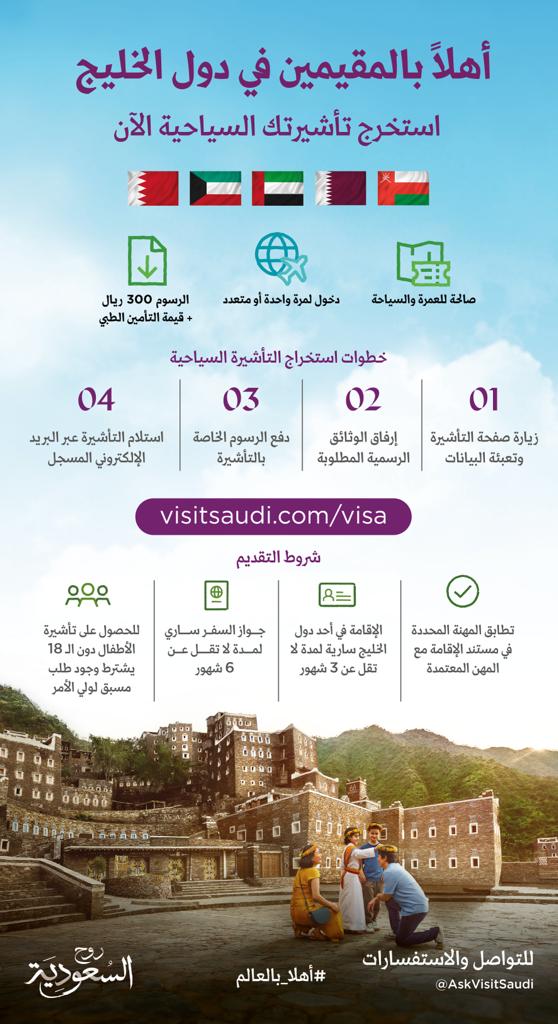 وبحسب التعديلات التي اعتمدها معالي وزير السياحة، أصبح بإمكان المقيمين في دول مجلس التعاون الخليجي؛ التقدم للحصول على التأشيرة إلكترونيًا ويشمل ذلك أقاربهم من الدرجة الأولى، وعاملي الخدمة المنزلية القادمين برفقة كفلائهم. ويمكن التقدّم للحصول على التأشيرة السياحية عبر موقع وتطبيق روح السعودية كما يمكن من خلالها الاطلاع على كافة متطلبات وإجراءات الحصول على التأشيرة، والتعرّف على الفعاليات النوعية والعالمية، والعروض الخاصة، والتخطيط لرحلاتهم وتجاربهم السياحية، والتواصل مع مقدمي الخدمات للاستعلام والحجز والدفع بكل يسر وسهولة.