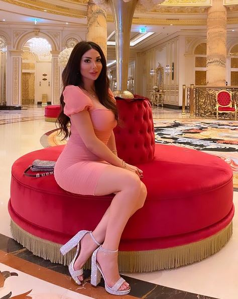 بفستان فوشي قصير وصدر منتفح مكشوف ، جلست نجمة باب الحارة دانا جبر على كرسي دائري مثير بلون احمر وسط صالة كبيرة في فندق ريفلز دبي الفخم التي نزلت فيه لقضاء اجازتها.