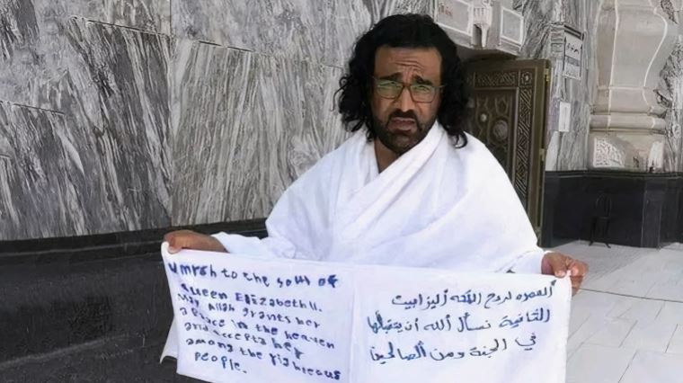شاب يمني يؤدي العمرة عن روح الملكة اليزابيث
