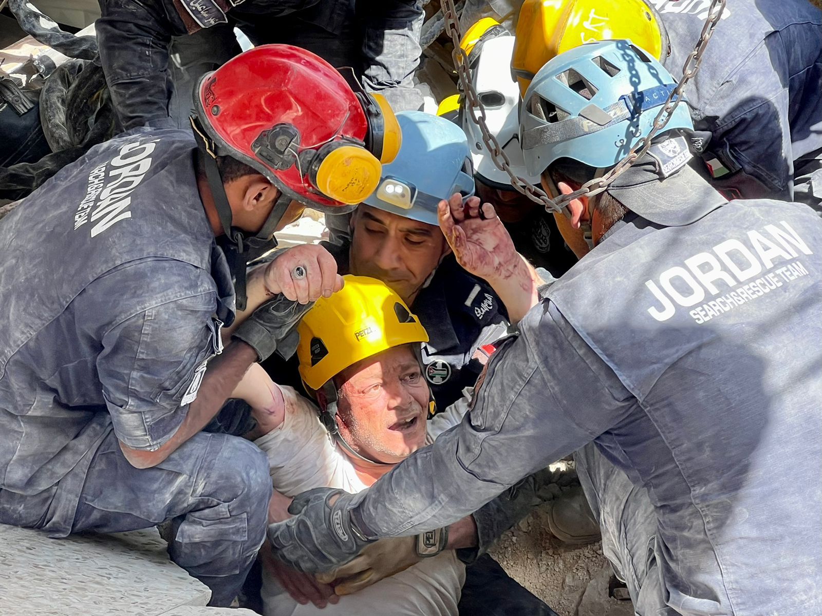 السوسنةـ صورة لهاني رستم احد الناجين لحظة إنقاذه من قبل فريق الإنقاذ بعد عشرين ساعة تحت الأنقاض.