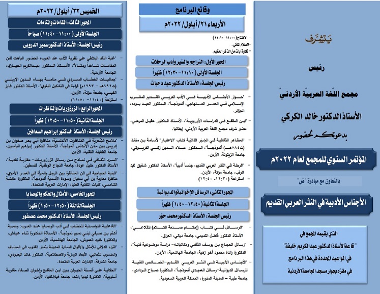 السوسنة - يعقد مجمع اللغة العربية الأردني يوم الأربعاء الحادي والعشرين من أيلول مؤتمره السنوي لهذا العام بعنوان "الأجناس الأدبية في النثر العربي القديم"، بالتعاون مع مبادرة "ض" إحدى مبادرات مؤسسة ولي العهد، ويستمر لمدة يومين.