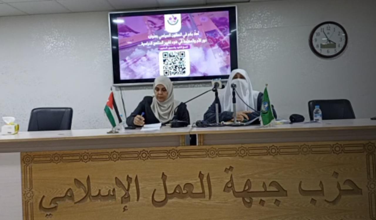 وأشارت رئيسة القطاع النسائي في الحزب الدكتورة ميسون دراوشة التي أدارت أعمال الندوة إلى أنها تأتي لمناقشة التغييرات على المناهج الدراسية خلال وأثرها على الأسرة والطلبة والدور المأمول من أولياء الأمور والمعلمين والمعلمات للتعامل مع أثر هذه التعديلات على الأبناء ومعالجة ما تتضمنه من ثغرات تمس قيم المجتمع وهويته العربية والإسلامية.