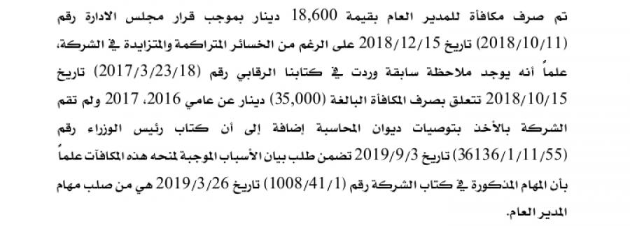 وأشار التقرير إلى وجود ملاحظة سابقة وردت في كتاب المحاسبة السابق رقم (2017/3/23/18) تاريخ 15 / 10 / 2018 تتعلق بصرف المكافأة البالغة (35,000) دينار عن عامي 2016 و 2017 ولم تقم الشركة بالأخذ بتوصيات ديوان المحاسبة.
