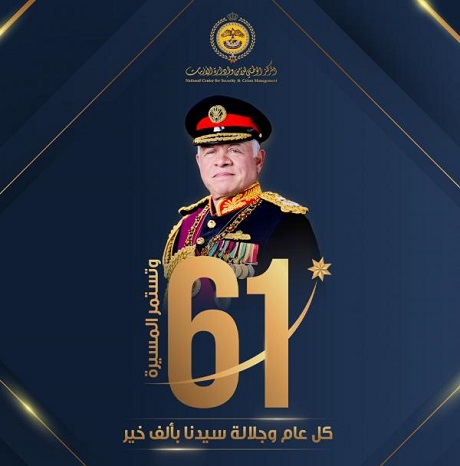 السوسنة - يرفع المركز الوطني للأمن وإدارة الأزمات إلى مقام حضرة صاحب الجلالة الهاشمية الملك عبدالله الثاني بن الحسين المعظم، أطيب آيات التهنئة والتبريك بمناسبة عيد ميلاده الحادي والستين، داعين الباري عز وجل أن يعيده على جلالته بموفور الصحة والعافية، وعلى الأسرة الأردنية بدوام الرفعة والازدهار.