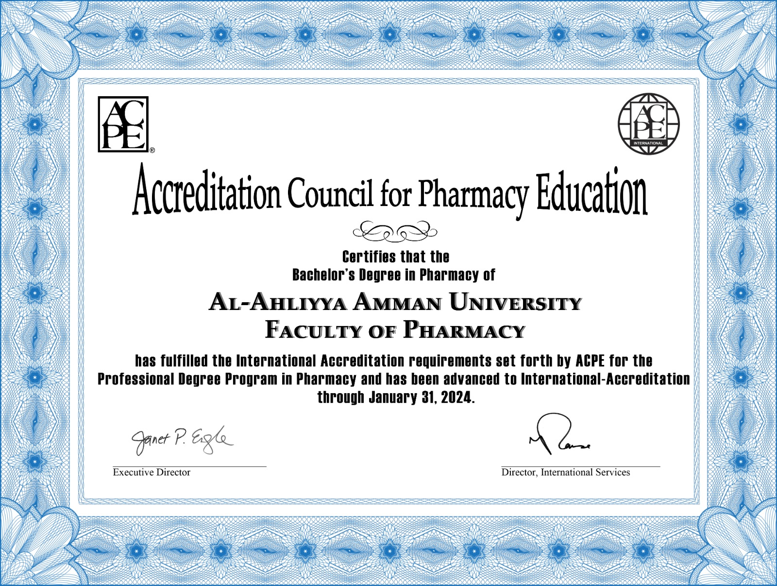 السوسنة - حصلت كلية الصيدلة في جامعة عمان الاهلية على شهادة الاعتمادية الدولية الأمريكية American council for pharmacy education والتي تعرف اختصارا بـ ACPE.
