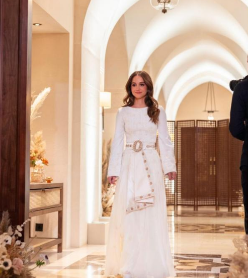 وفيما يتعلق بتصميم فستان الأميرة في هذه الليلة المميزة، نشرت المصممة الأردنية الشابة ريما دحبور على صفحتها على الانستغرام انها صممت الثوب التراثي للأميرة ايمان في ليلة الحناء، حيث جمع بين البساطة والفخامة وجاء باللون الأبيض المزين بالكريستال الذهبي ومطرز بالزهور البيضاء.
