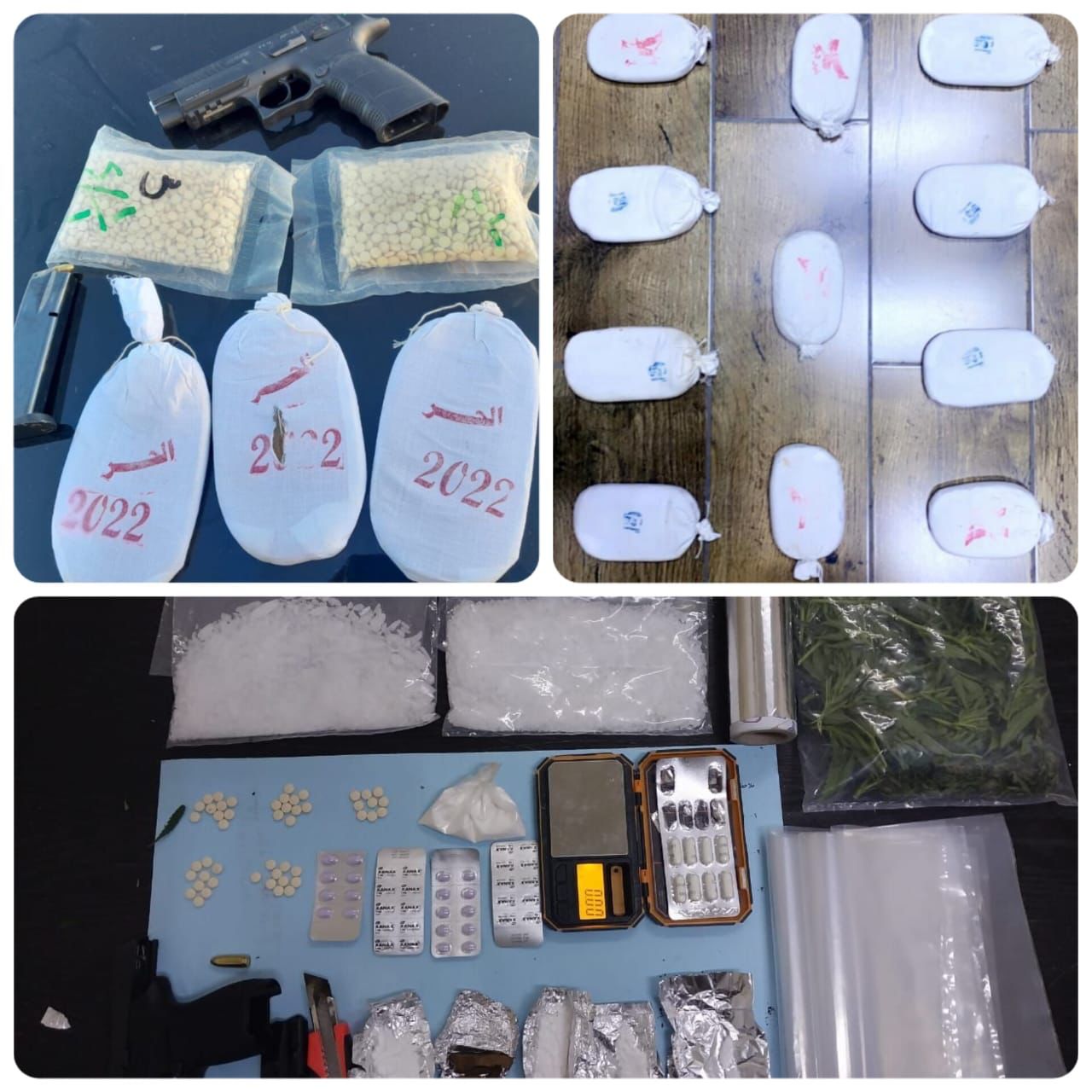 وفي إحدى مناطق غرب البلقاء وبعد جمع المعلومات عن قيام أشخاص من مروجي المخدرات وتجارها باستخدام أحد المنازل لزراعة مادة الماريجوانا المخدرة إذ جرت مداهمته وأُلقي القبض داخله على شخصين وضُبط بحوزتهما سلاح ناري اضافة الى 313 شتلة من اشتال الماريجوانا المخدرة ، وفي محافظة مادبا أُلقي القبض على مروجَين مسلحَين داخل مركبتهما أثناء نقلهما لكمية من المخدرات وضبط داخل المركبة تسعة كفوف حشيش و 2000 حبة مخدرة .
