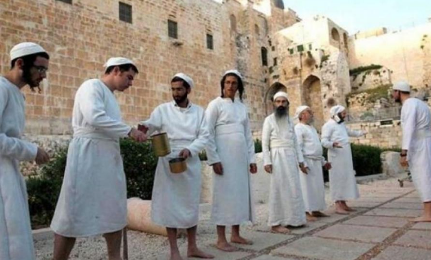 وتشمل مراسم "عيد الفصح" اليهودي وفق الزعم التلمودي قيام حاخام أو مستوطن يهودي متدين بزي "كهنة الهيكل" المزعوم بذبح القربان عند أقدام المذبح وشوائه.