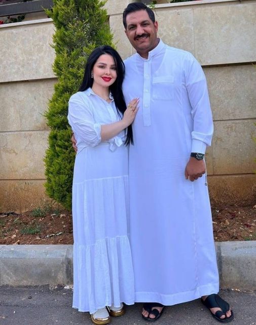 وظهرت كرزون من أمام منزلها وهي ترتدي فستانا باللون الأبيض، مسدلة شعرها، ومتزينة بمكياج زاد من سحر إطلالتها، وكانت برفقة زوجها معاذ العمري الذي كان يرتدي دشداشة بيضاء.