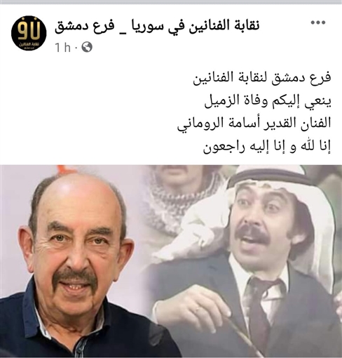 ونعت نقابة الفنانين في سوريا عبر حسابها في فيسبوك الفنان أسامة الروماني حيث قالت: فرع دمشق لنقابة الفنانين ينعي إليكم وفاة الزميل الفنان القدير أسامة الروماني إنا لله وإنا إليه راجعون.