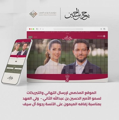 السوسنة - أطلقت مؤسسة ولي العهد، منصة إلكترونية مخصصة لإرسال التهاني والتبريكات إلى سمو الأمير الحسين بن عبدالله الثاني، ولي العهد، والآنسة رجوة آل سيف بمناسبة الزفاف.