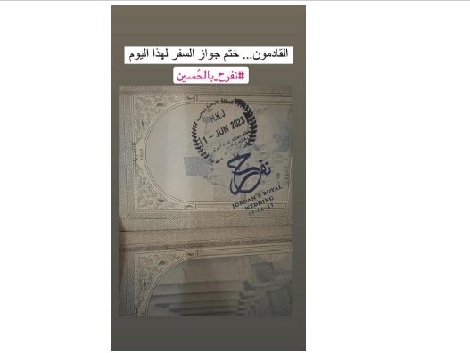 السوسنة - تفاجأ القادمون إلى الأردن منذ منتصف الليلة الماضية باستخدام ختم دخول مخصص للاحتفال بزفاف سمو ولي العهد، الأمير الحسين بن عبد الله الثاني.