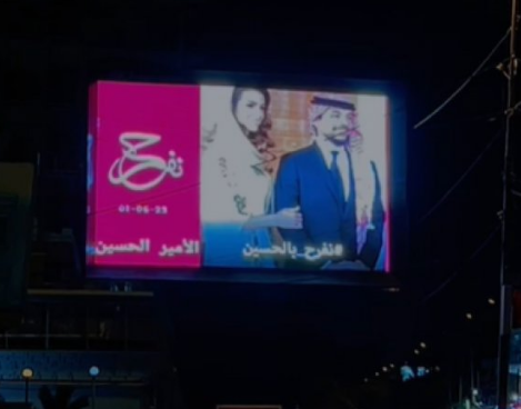 وعلقت مبادرات عراقية شاشات عرض في شوارع العاصمة بغداد تهنئ ولي العهد والأردنيين، بمناسبة الزفاف الملكي، ويافطات تحمل وسم "نفرح بالحسين".