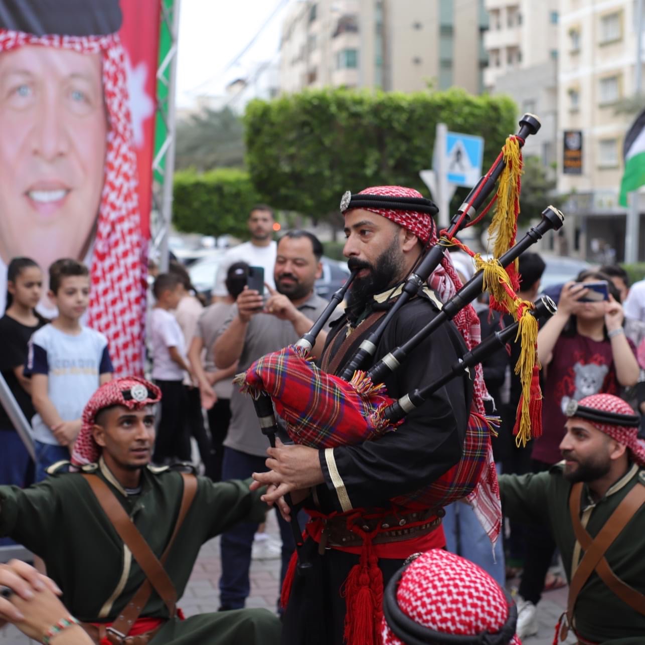 وأحتشد المواطنون الفلسطينيون قبالة أحد المولات الكبرى بمدينة غزة بينهم نساء وأطفال للمشاركة في احتفال أعد بمناسبة الزفاف الميمون، حيث شاركت فرقة دبكة في إحياء الحفل واشتمل الحفل كذلك على فقرات فنية وموسيقية .