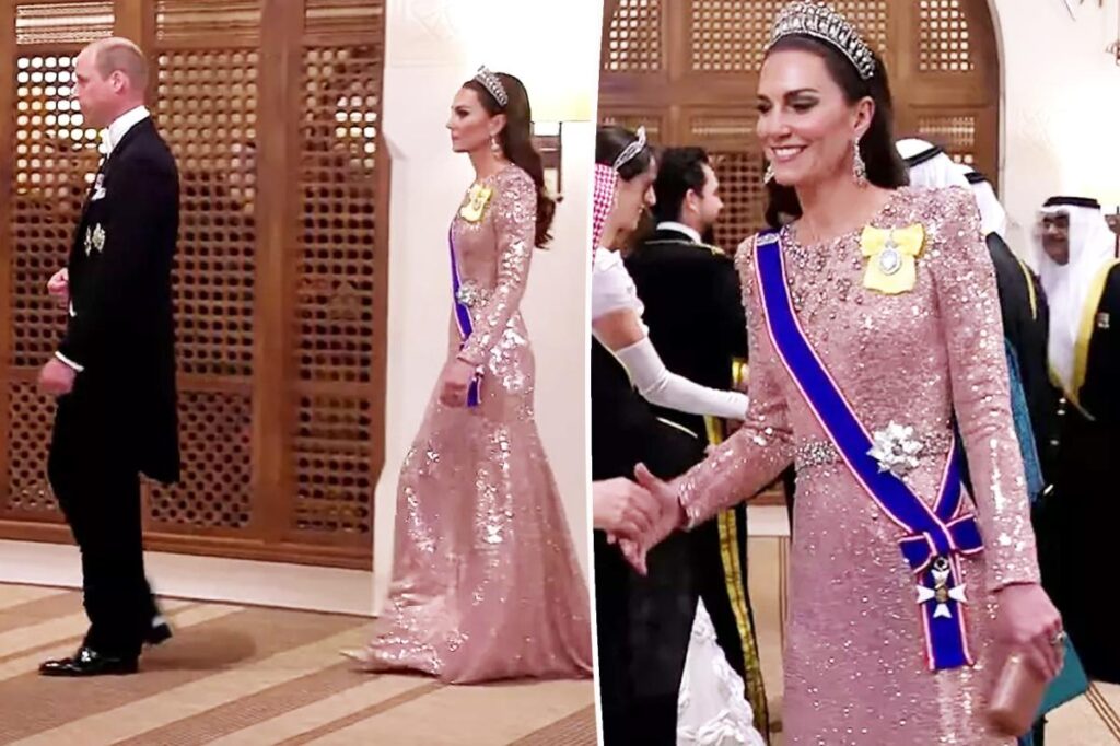 السوسنةـ ظهرت كيت ميدلتون في نسخة جديدة من فستان سهرة قديم مفضل، مرتدية فستان جيني باكهام من الذهب الوردي ومزين بالترتر ومجوهرات ملكية ذات مغزى لحفل زفاف ولي العهد الأمير حسين والاميرة رجوة السيف في الأردن.