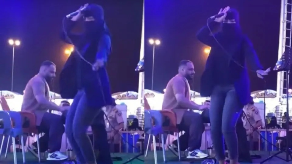 تداول النشطاء على مواقع التواصل، مقطع فيديو ظهرت فيه مطربة سعودية منقبة وترتدي بنطال ضيق وملابس لا تليق بالنقاب، وهي ترقص وتغني بمكان عام.