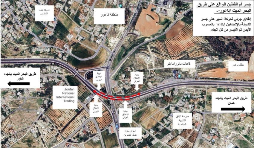 وقالت الوزارة في بيان صحفي صادر عن وحدة الإعلام والاتصال اليوم السبت، إنه سيتم اجراء تحويلات مرورية على الجسر في منطقة العمل بشكل جزئي، إذ سيتم اغلاق المسرب الأيمن لتنفيذ اعمال الصيانة اللازمة ومن ثم الانتقال الى المسرب الاخر وبالاتجاهين تباعًا بحسب الإشارات الارشادية التي سيجري تركيبها.