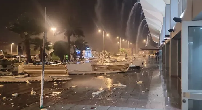 أدت الرياح إلى إصابة بعض المسافرين، بينهم 4 أطفال على الأقل؛ جرّاء تحطّم واجهة المطار الزجاجية.