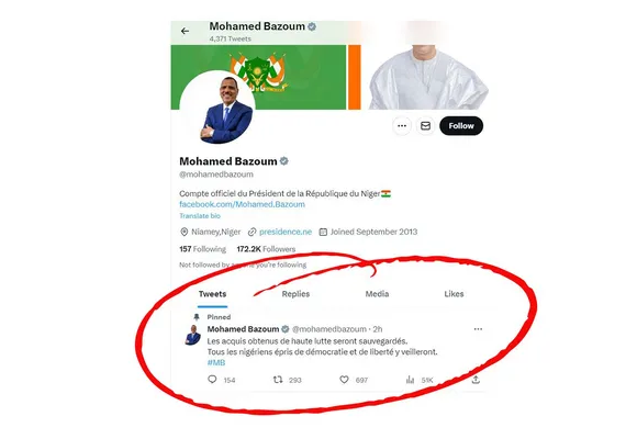 السوسنة - أكد رئيس النيجر محمد بازوم، الذي يحتجزه عسكريون انقلابيون في القصر الرئاسي في نيامي، اليوم الخميس، في رسالة عبر خدمة "إكس" المعروفة سابقاً بـ"تويتر"، أن "المكتسبات الديموقراطية ستصان".