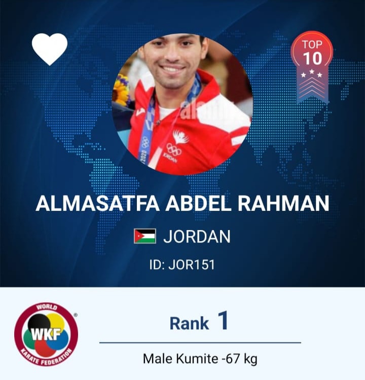 وفي التفاصيل فإن البطل الاولمبي الدكتور عبدالرحمن المصاطفة تصدر التصنيف الدولي لوزن - 67 كغم، فيما حل البطل محمد الجعفري في المركز الثاني لوزن -84 كغم .