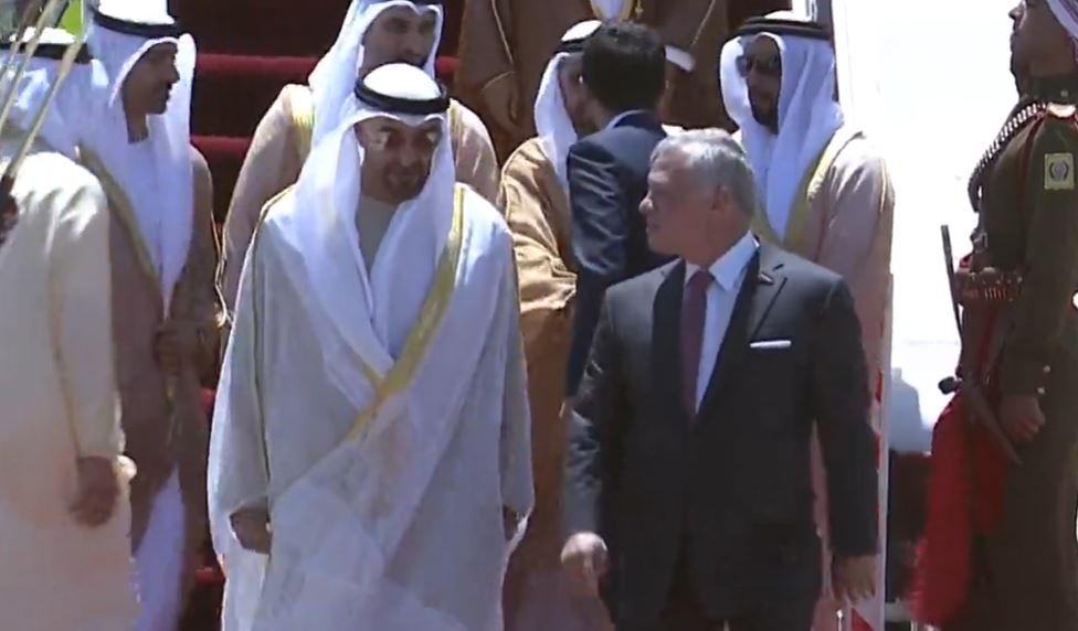 وصل الى عمان ظهر الاربعاء الرئيس الامارتي الشيخ محمد بن زايد ، حيث كان في مقدمة مستقبليه جلالة الملك عبدالله الثاني بن الحسين وسمو الأمير الحسين بن عبدالله الثاني ولي العهد في مطار ماركا.
