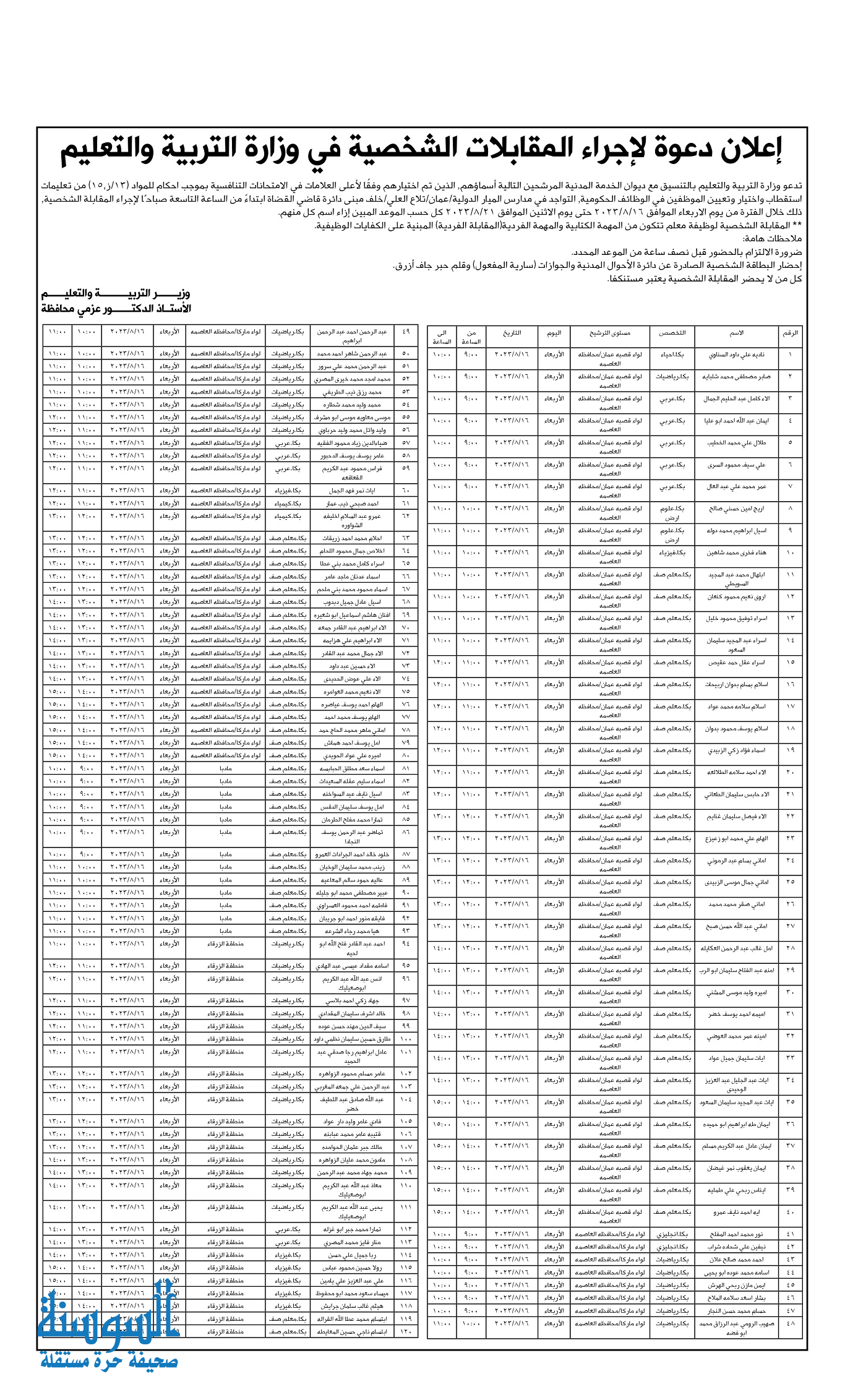 وطلبت الوزارة من المرشحين الإلتزام بالحضور قبل نصف ساعة من الموعد المحدد واحضار والبطاقة الشخصية وقلم حبر جاف ازرق ،واكدت الوزارة بأن كل من تخلف عن الموعد يعتبر مستنكفاً.