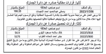 وأكدت الدائرة في إعلان لها نشر في الصحف اليومية، أنه إذا لم يتم الاعتراض على قرارات التغريم والتحصيل، خلال 30 يوما من تاريخ التبليغ يصبح القرار قطعيا ويتم التحصيل بجميع وسائل التنفيذ على الأموال المنقولة وغير المنقولة وفقا لأحكام المادة (232) من قانون الجمارك