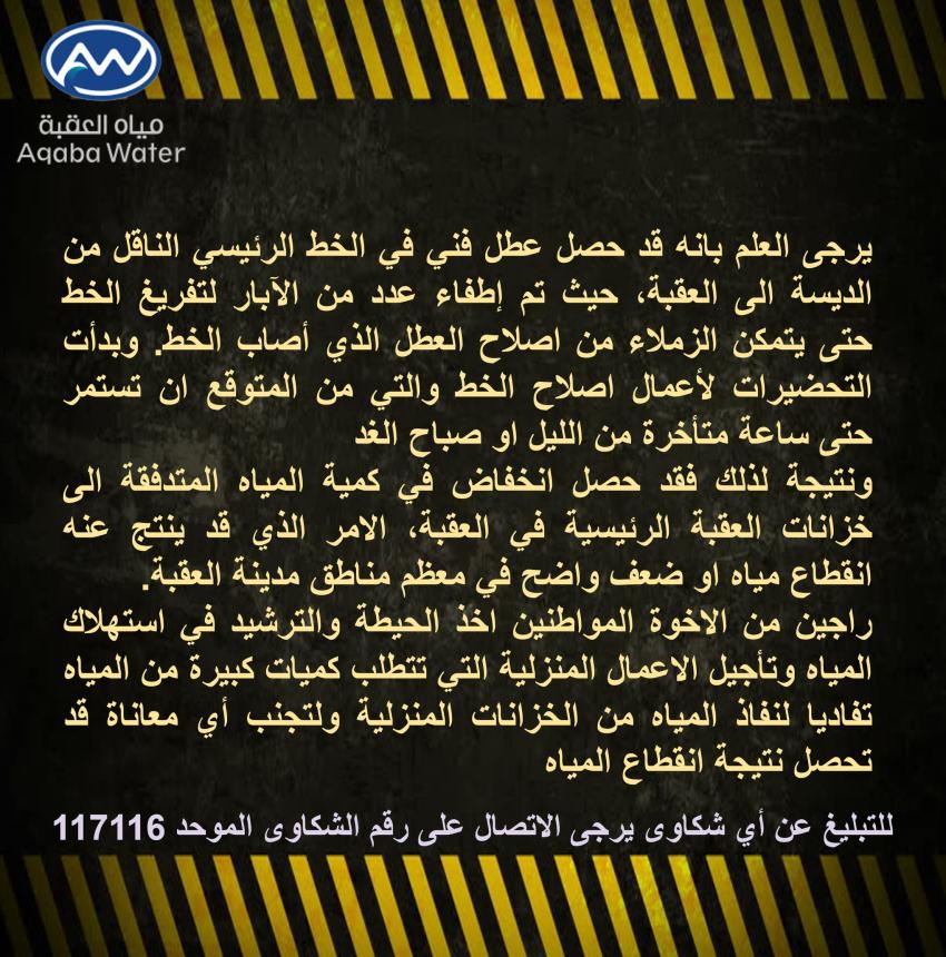 نشرت شركة مياه العقبة ، إعلانا الجمعة ، عن انقطاع الماء عن مناطق بالعقبة بسبب عطل فني في الخط الرئيسي الناقل من الديسة إلى العقبة.