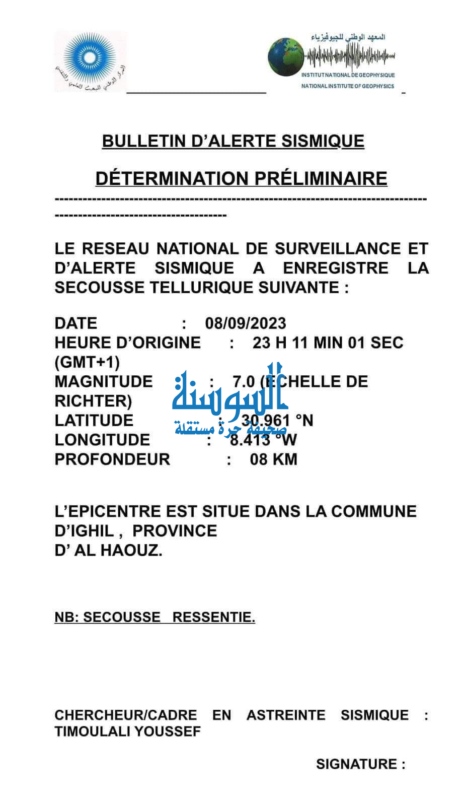 قال المعهد الوطني المغربيّ للجيوفيزياء، في بيان له (مرفق أسفل الخبر)، إنّه تمّ تسجيل هزة أرضية بلغت قوتها 7 درجات على سلم ريختر، صباح السبت، بإقليم الحوز، التابع لمراكش آسفي.