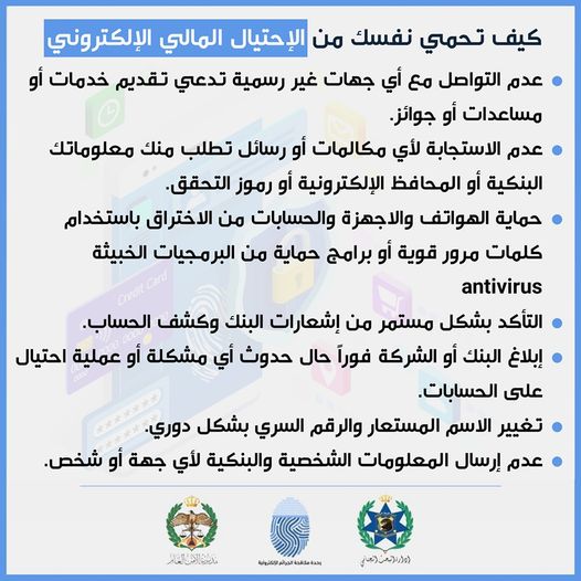 نشرت مكافحة الجرائم الإلكترونية التابعة لإدارة البحث الجنائي في مديرية الأمن العام، الاثنين، تحذيرا من الاحتيال المالي الإلكتروني.