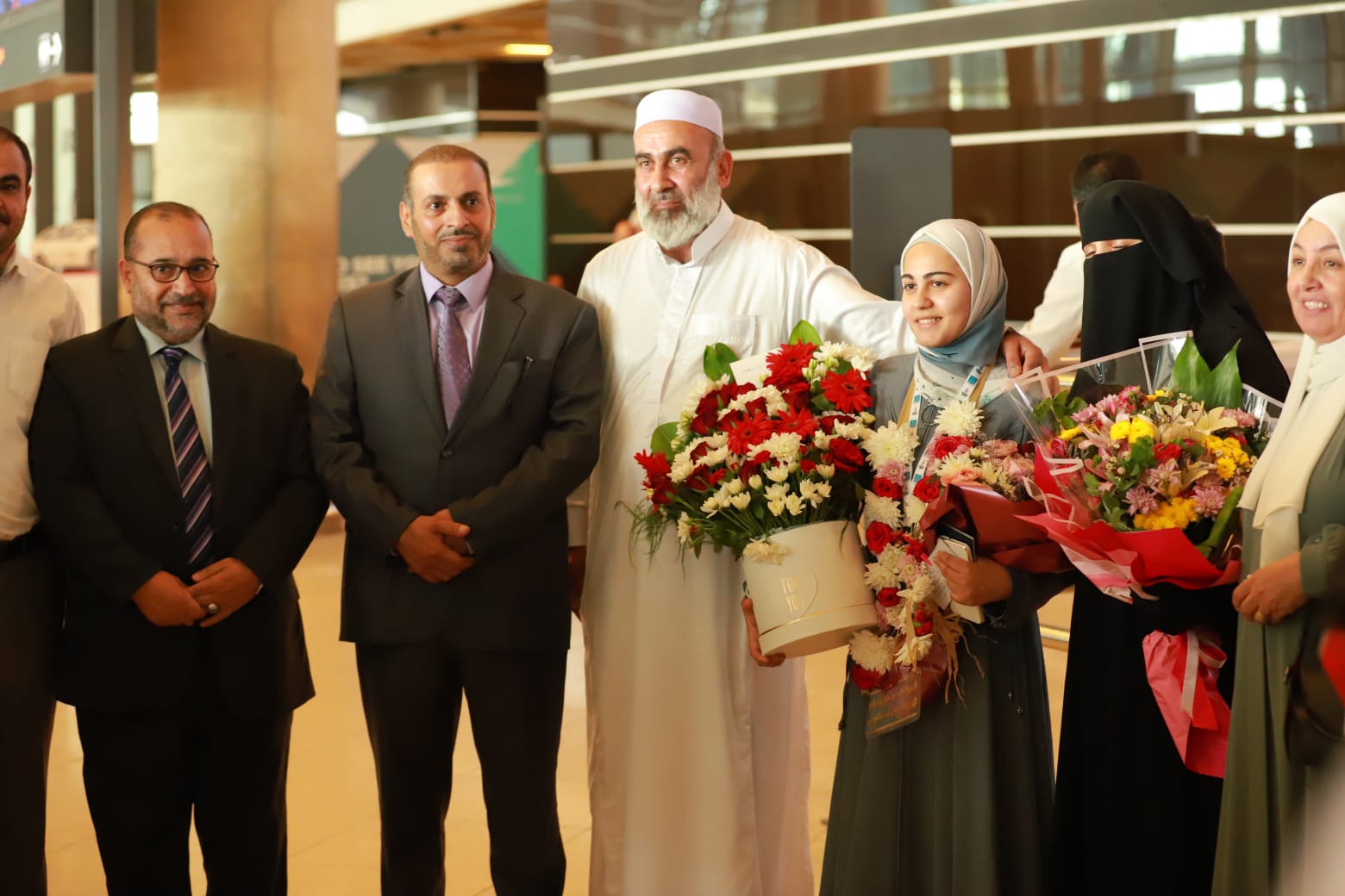 استقبل مندوب وزير الأوقاف والشؤون والمقدسات الإسلامية، أمين عام الوزارة الدكتور عبدالله العقيل، السبت، بمطار الملكة علياء الدولي، الطالبة سندس الصيداوي الفائزة بالمركز الأول في مسابقة الشيخة فاطمة بنت مبارك الدولية للقرآن الكريم للإناث.