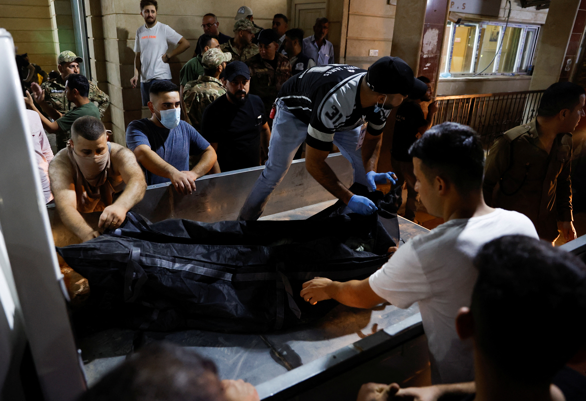 وأضافت أن فرق الدفاع المدني استنفرت بغضون دقائق وطوقت النيران ونفذت عمليات الاقتحام المباشر ونجحت بالدخول وسط القاعة المحترقة لتباشر بعمليات الإنقاذ للعوائل من النساء والأطفال بالتزامن مع تنفيذ عمليات الإخماد للحريق الذي أدى إلى انهيار أجزاء من القاعة نتيجة استخدام مواد بناء سريعة الاشتعال واطئة الكلفة تتداعى خلال دقائق عند اندلاع النيران.